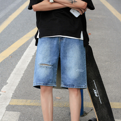 Summer denim shorts men's hole straight tube trendy loose 5-point jeans
