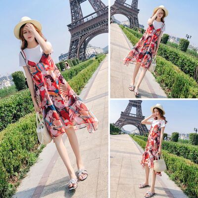 Suspender dress women's summer dress new mid length French niche floral suspender skirt two piece set