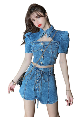 Real shot fashion short sleeve new sexy hollow out denim Top + washing bandage shorts denim suit