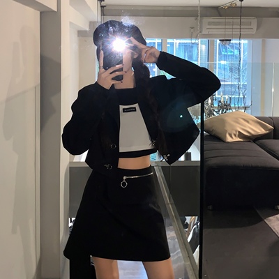 Real shot fashionable short off shoulder T-shirt long sleeve top suspender vest two piece set