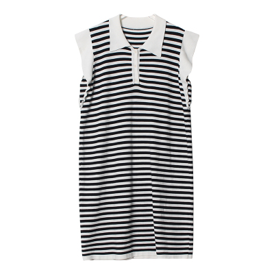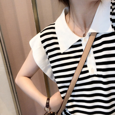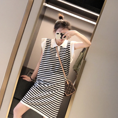 Feifei sleeve ice silk knitted dress women's black and white stripe collar casual loose skirt summer new