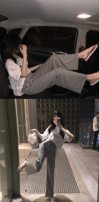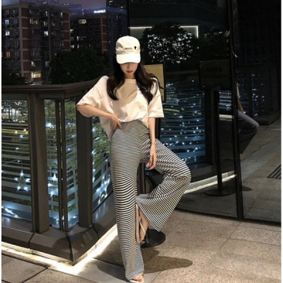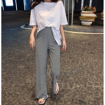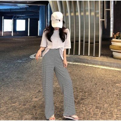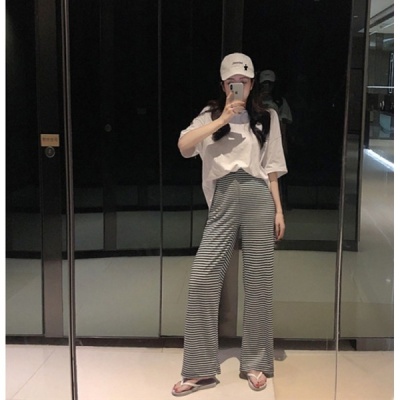 Net red loose fitting half short sleeve split T-shirt stripe wide leg casual pants elegant two piece suit women's summer