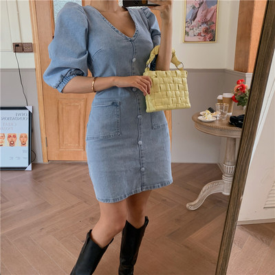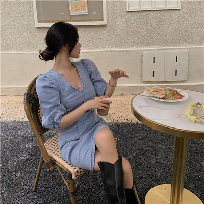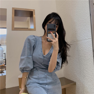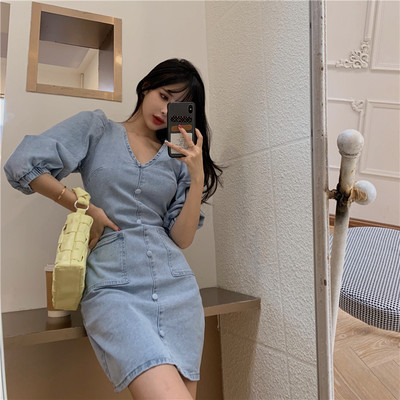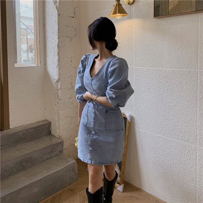 5 ~ retro sexy V-neck show thin heavy industry bubble sleeve back zipper denim dress