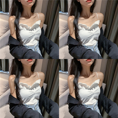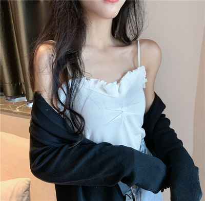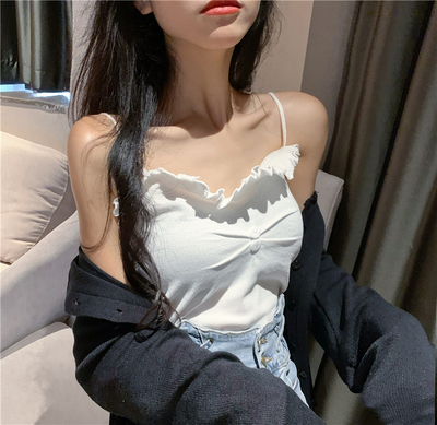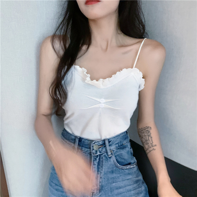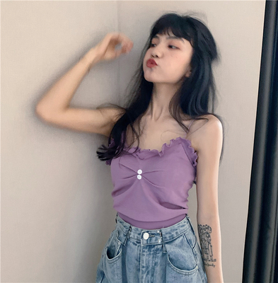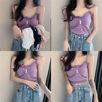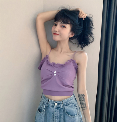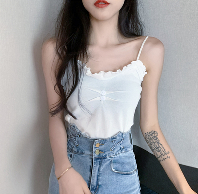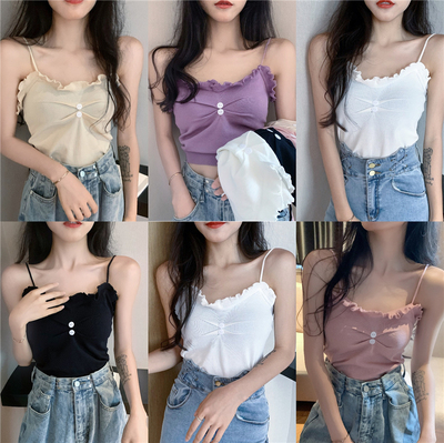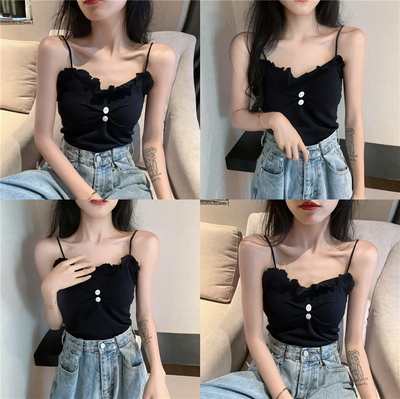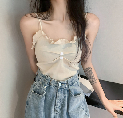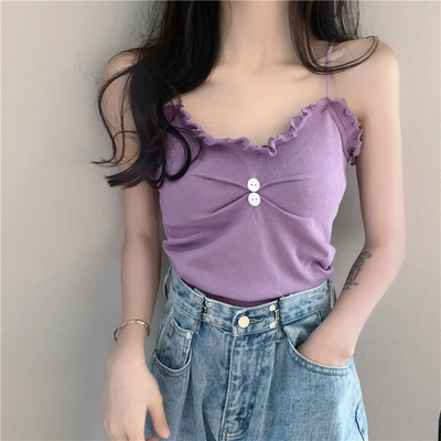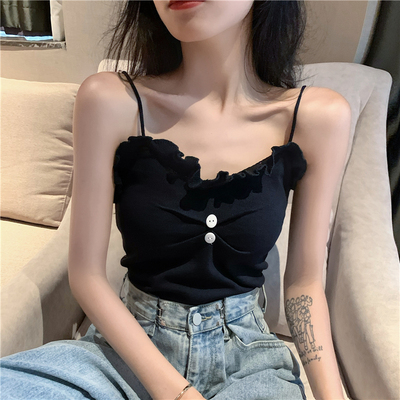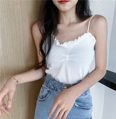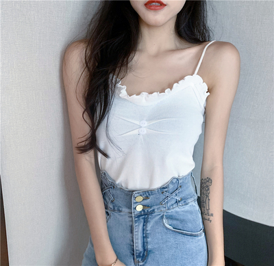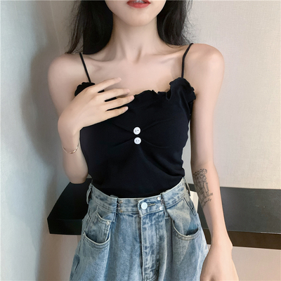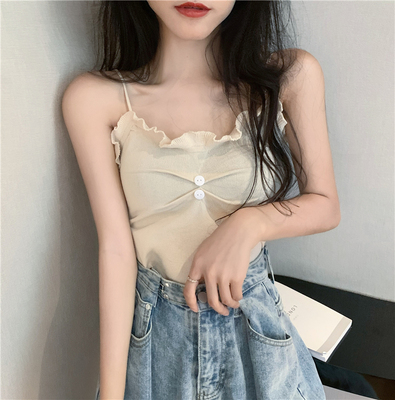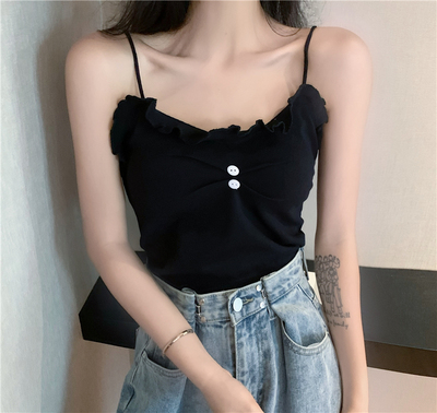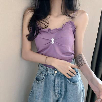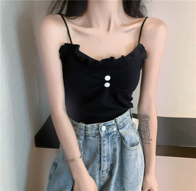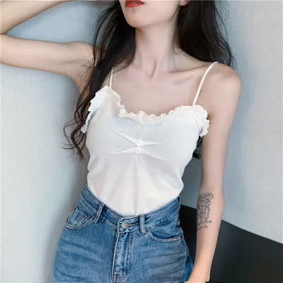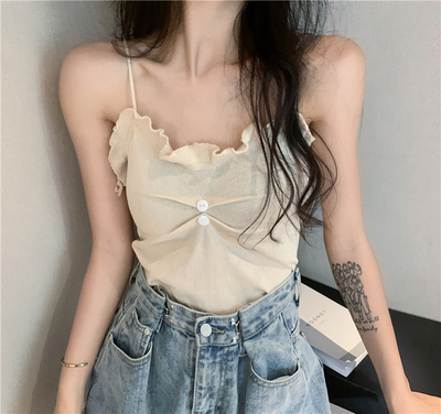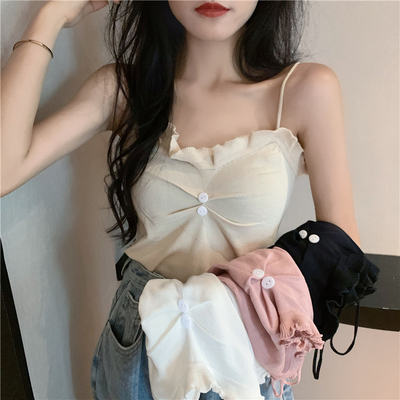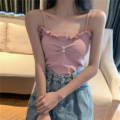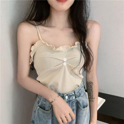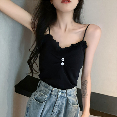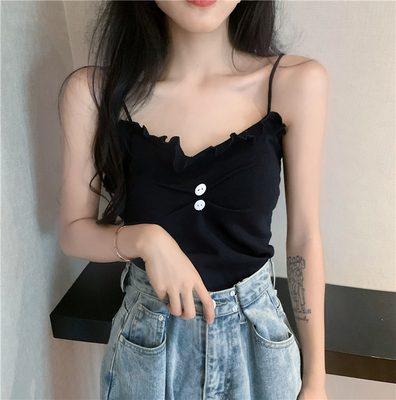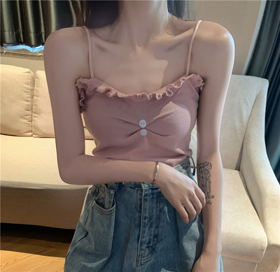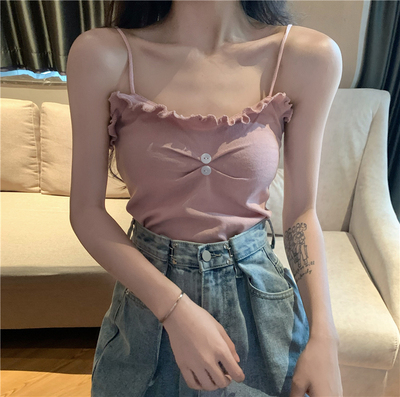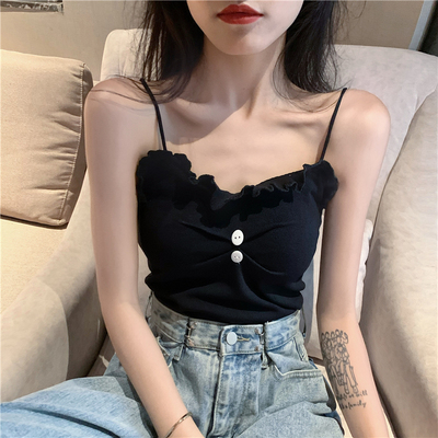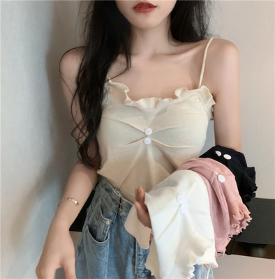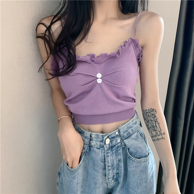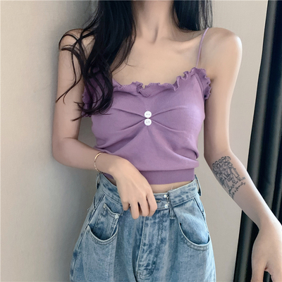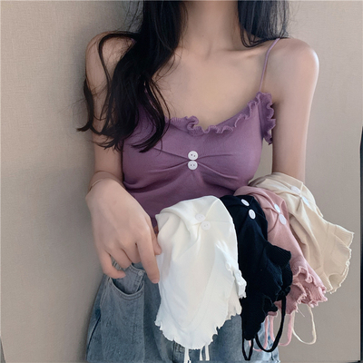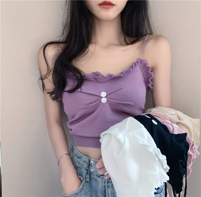 2021 Korean button decorative pleated wooden ear edge knitted suspender vest for women's summer Bra Top