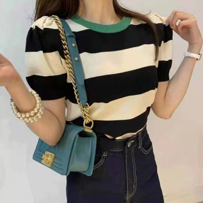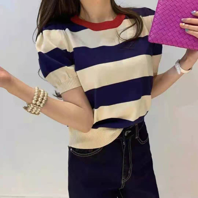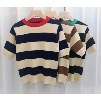 Korean autumn crowd round neck Pullover design color matching stripe slim long sleeve sweater