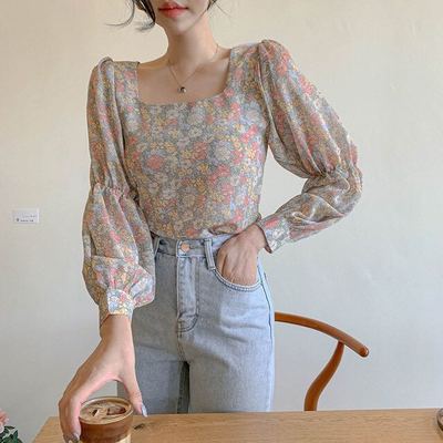 Korean style gentle girl feeling French style gentle and sweet foreign style broken flower square collar Lantern Sleeve