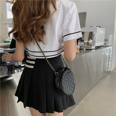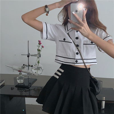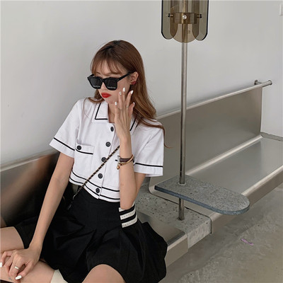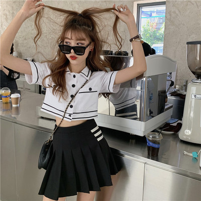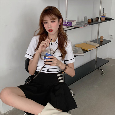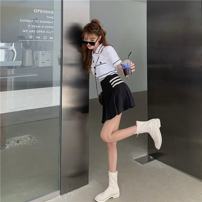 #Real price high waist versatile slim pleated skirt skirt + Lapel contrast short sleeve T-shirt suit