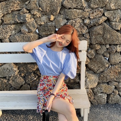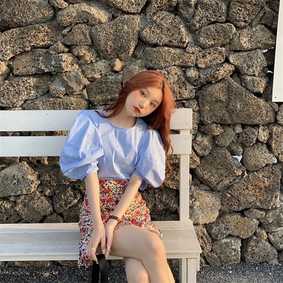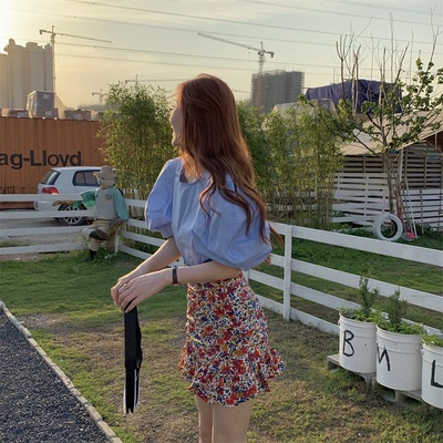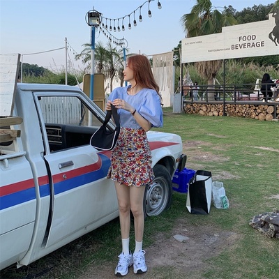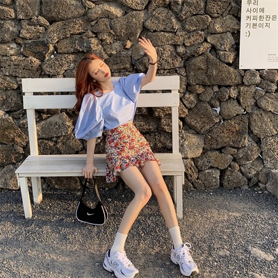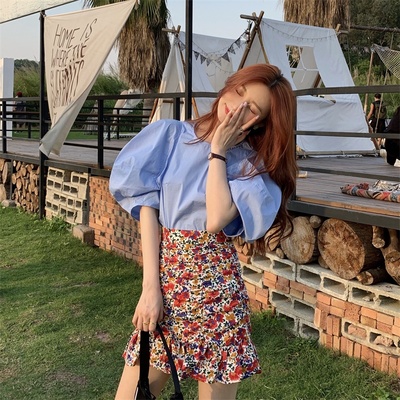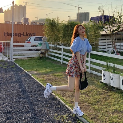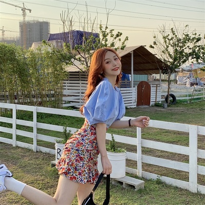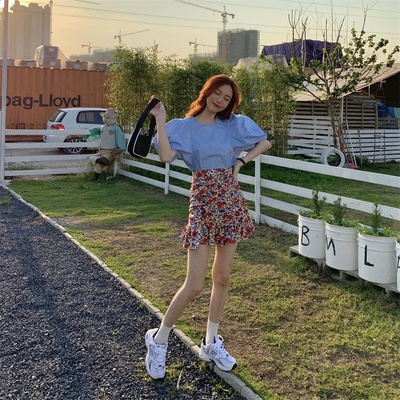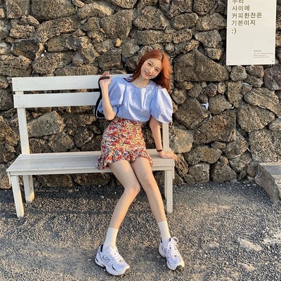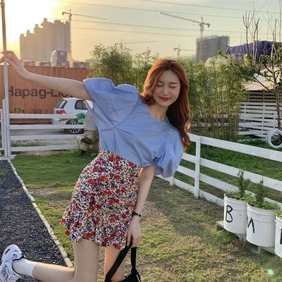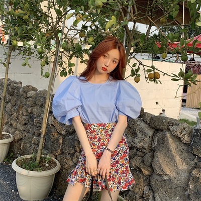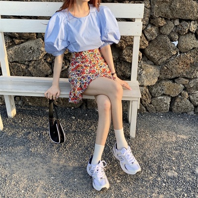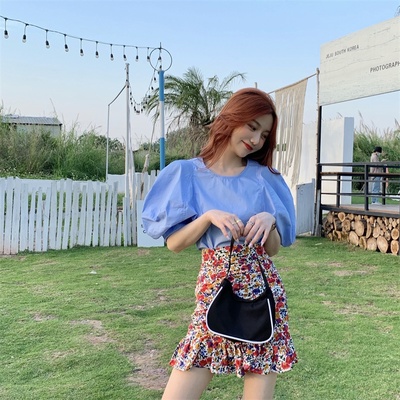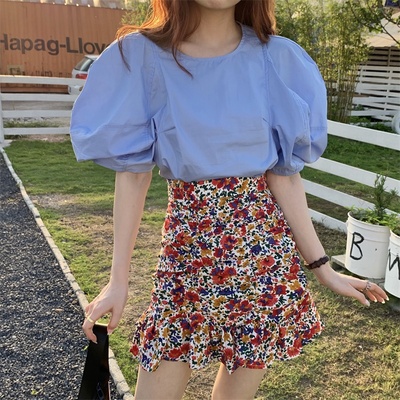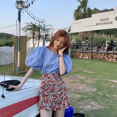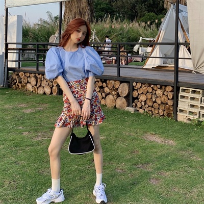 Real price Korean slim high waist Floral Chiffon Skirt + round neck Lantern Sleeve Top