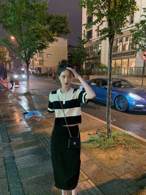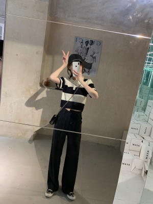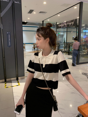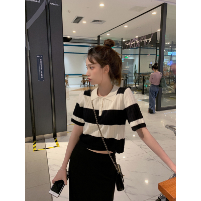 Black and white stripe splicing Short Sleeve Shirt Short open navel collar T-shirt women's summer