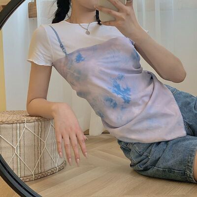 Real photo 2021 new blue purple halo dye suspender Vest + white base Auricularia edge slim short sleeve