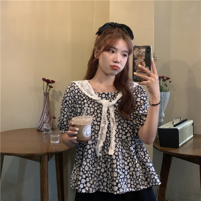 Real shot 2021 summer new Korean version small floral Short Sleeve Chiffon baby shirt Lace Shawl two piece suit