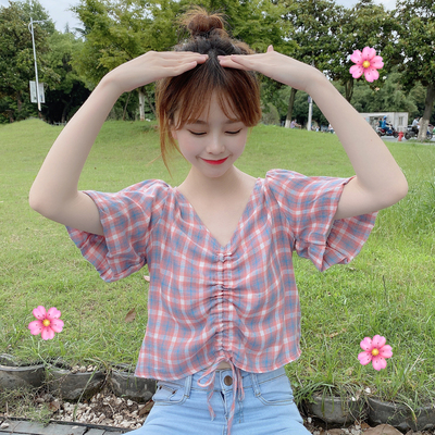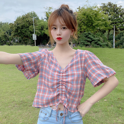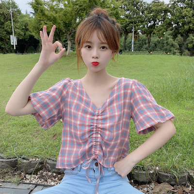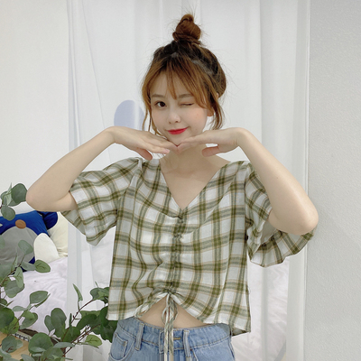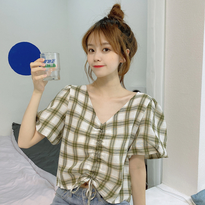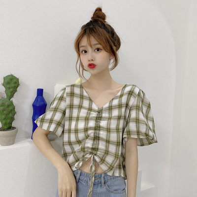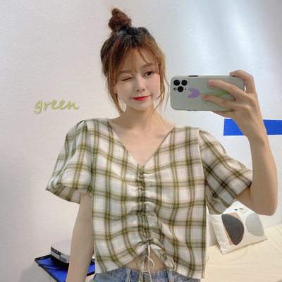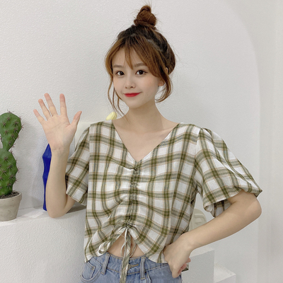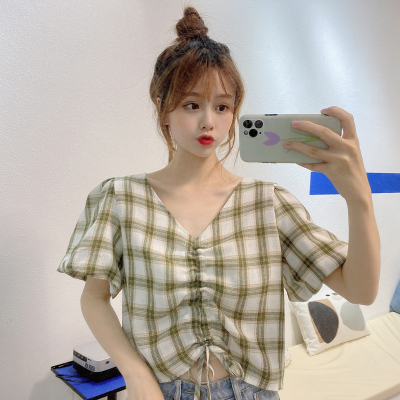 Real price cotton plaid shirt women's drawstring bubble sleeve short sleeve collar short open navel