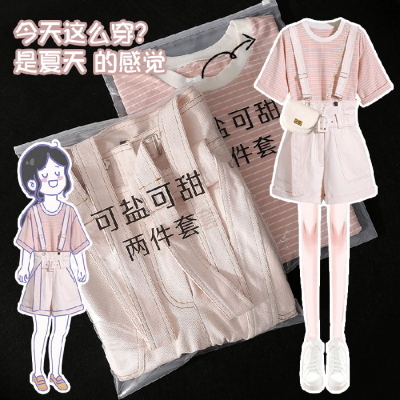 Summer fashion Korean female student loose casual shorts T-shirt + high waist suit with two-piece strap stripe