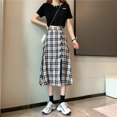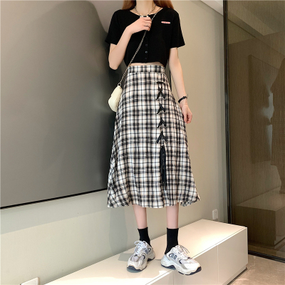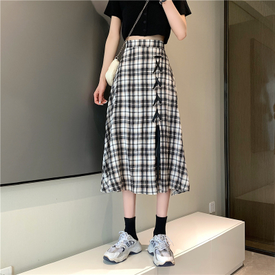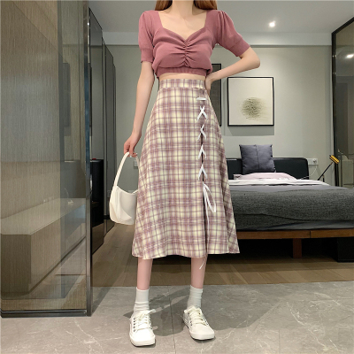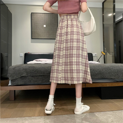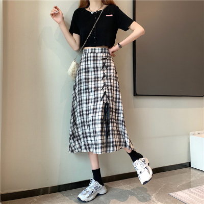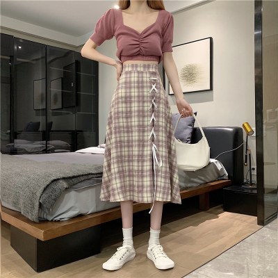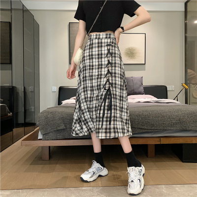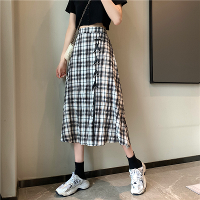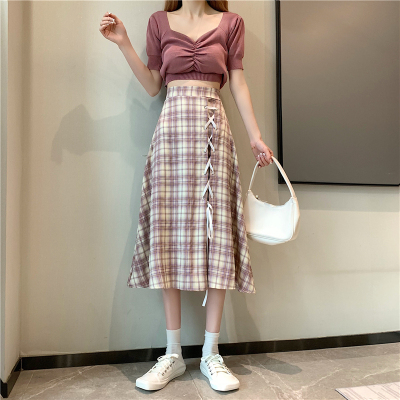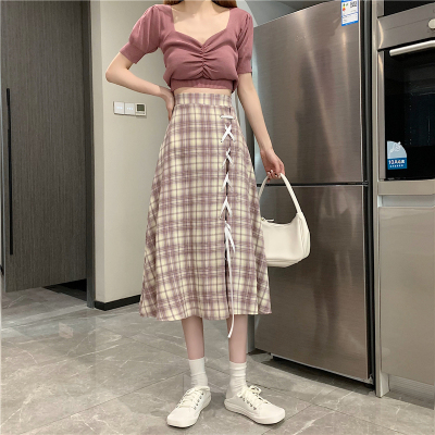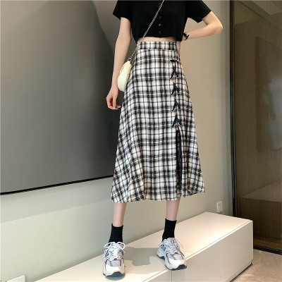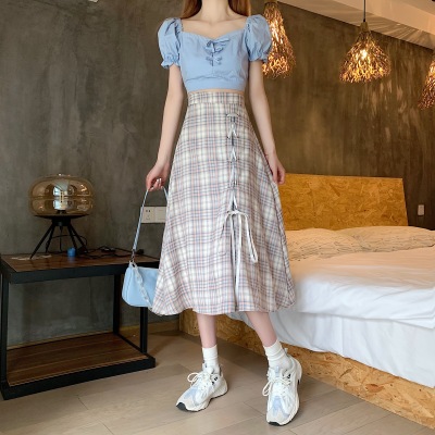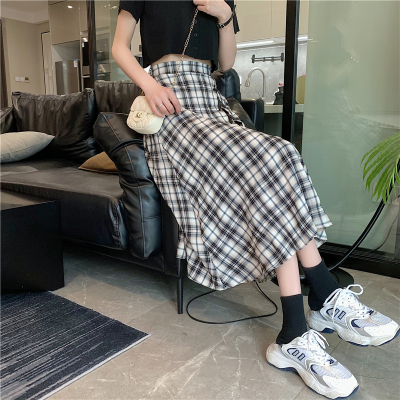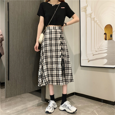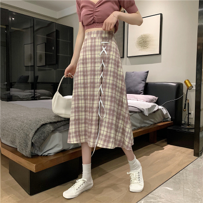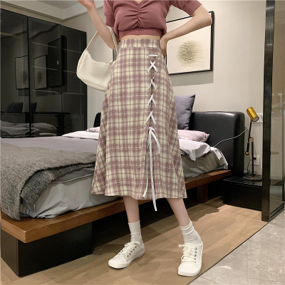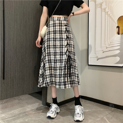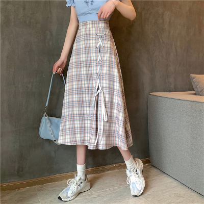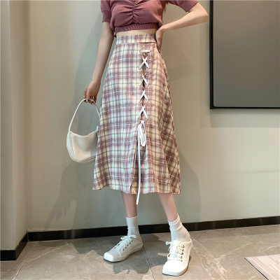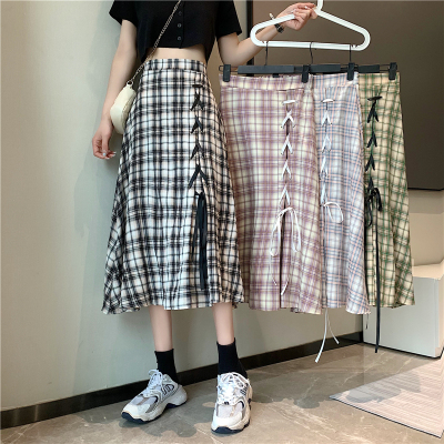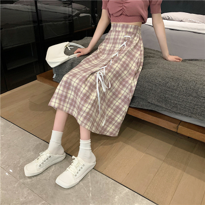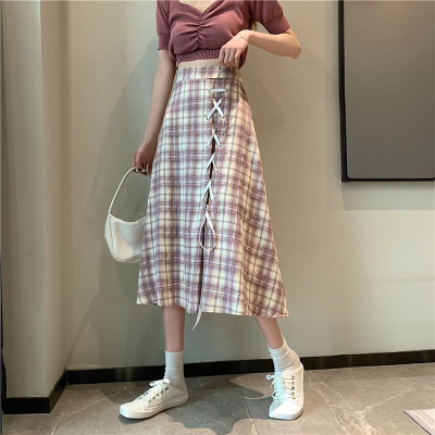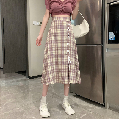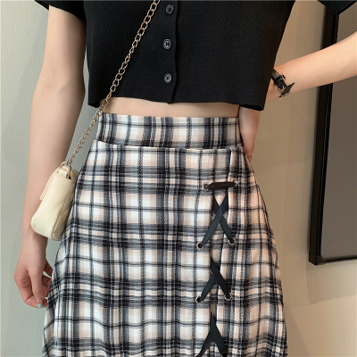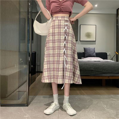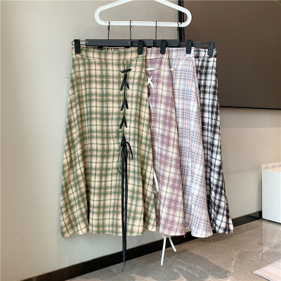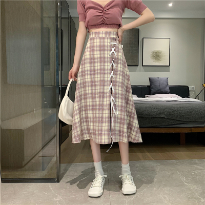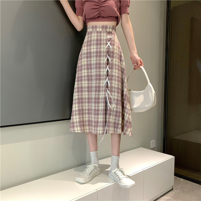 Real price ~ plaid skirt women's Korean high waist A-line mid length bandage umbrella skirt