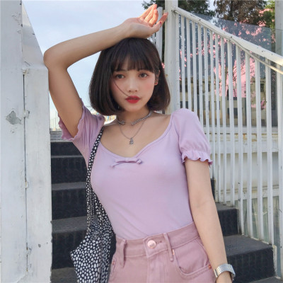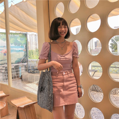 Women's Retro square neck bow tie slim short sleeve Knitted Top T-shirt + skirt