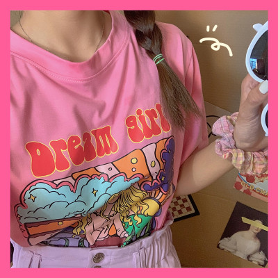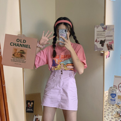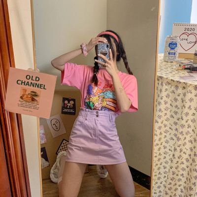 Real print short sleeve French fairy round neck T-shirt + purple skirt