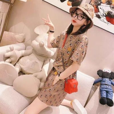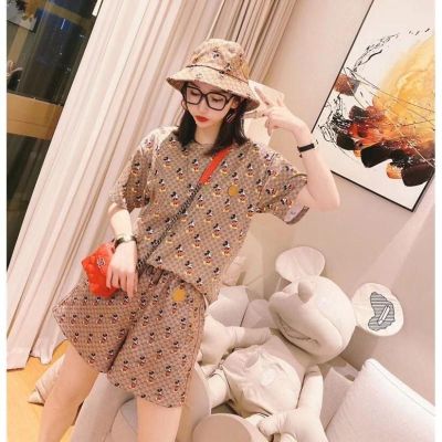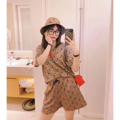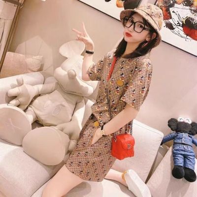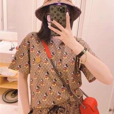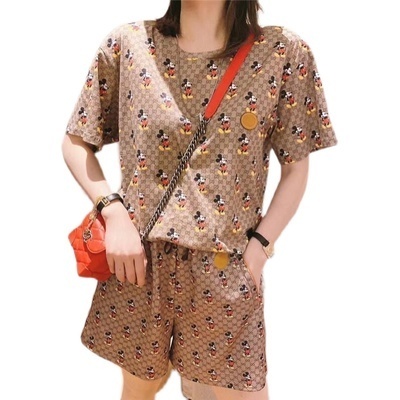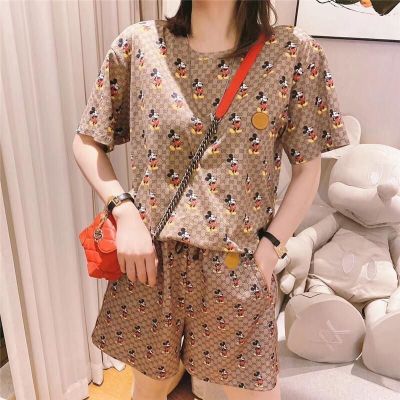 European double Mickey Mouse cartoon print short sleeve T-shirt women's loose drawstring casual shorts two piece set
