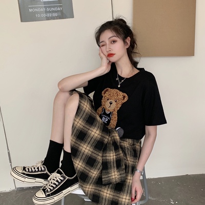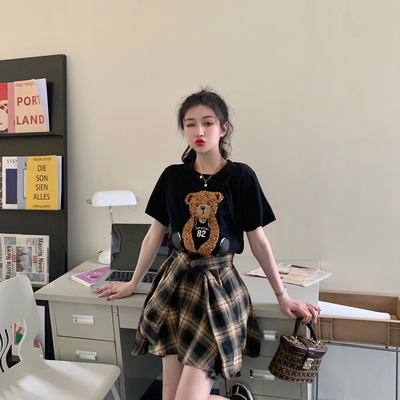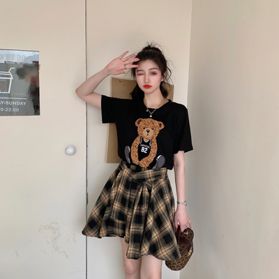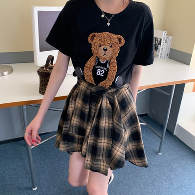 Real price Korean bear T-shirt with plaid skirt children's summer leisure Street