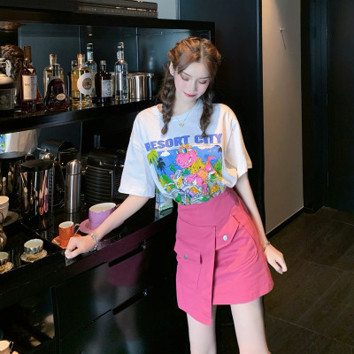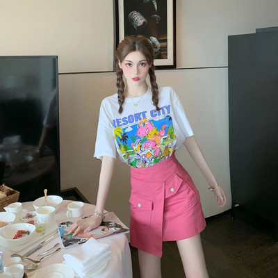 Real shot, real price, teenage girl's feeling full of cartoon dinosaur T-shirt short sleeve + pink high waist slim A-line short skirt