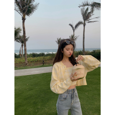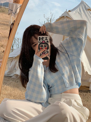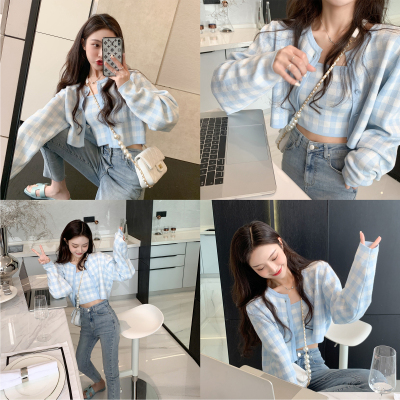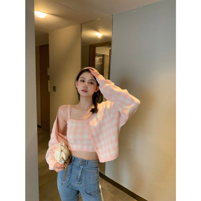 Young girl's fresh contrast Plaid suit soft cute temperament knitted cardigan suspender vest two piece set short