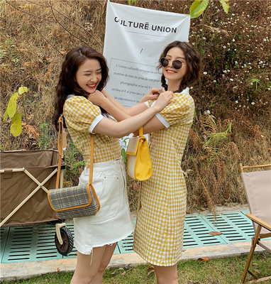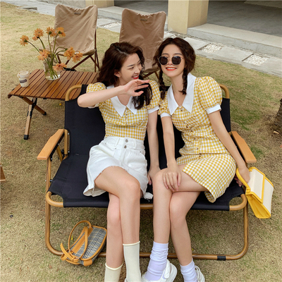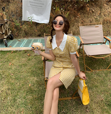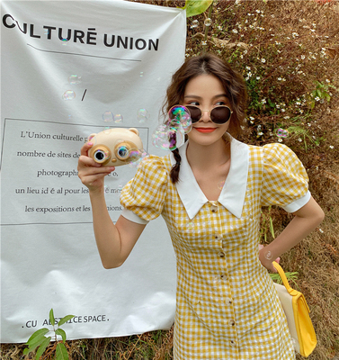 Real shooting ~ ~ New Retro French Plaid bubble sleeve dress top fashion in spring and summer of 2021
