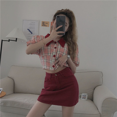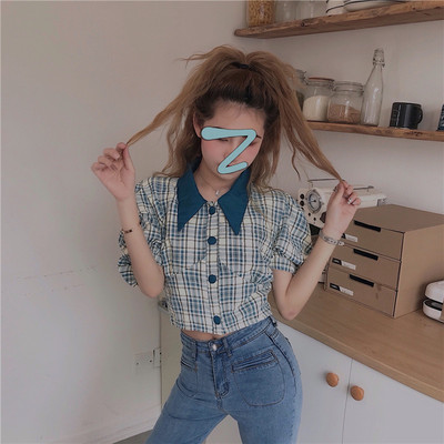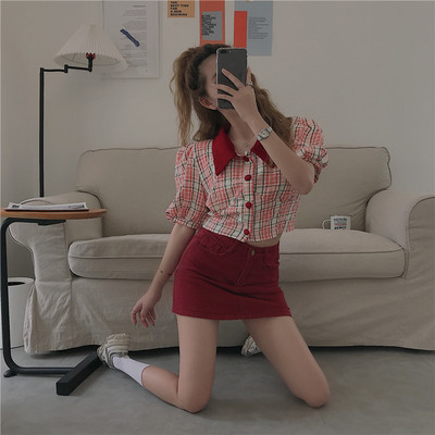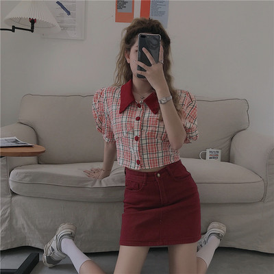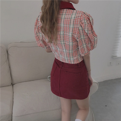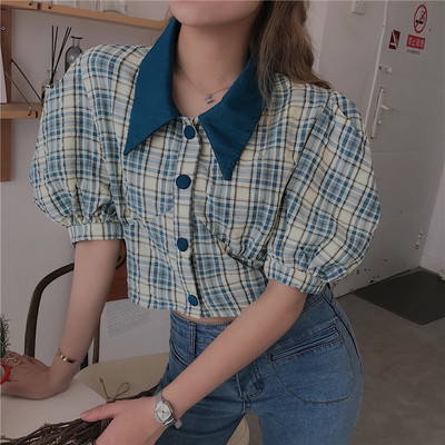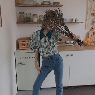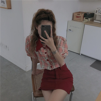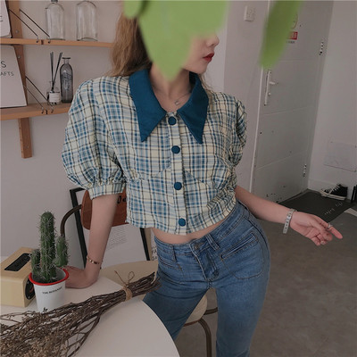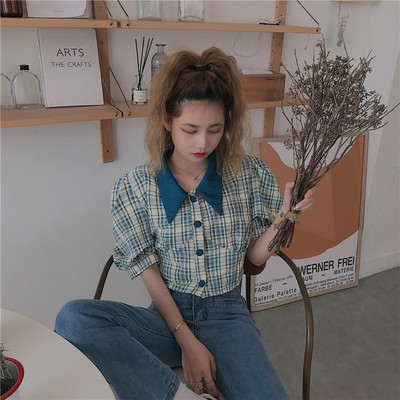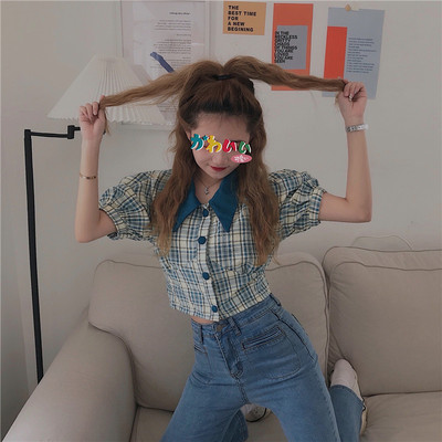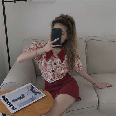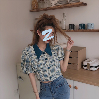 Real price ~ summer short shirt women's design bubble sleeve French retro western style sweet Plaid Shirt