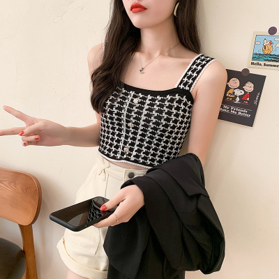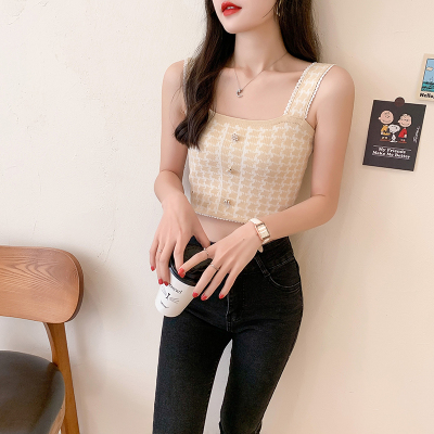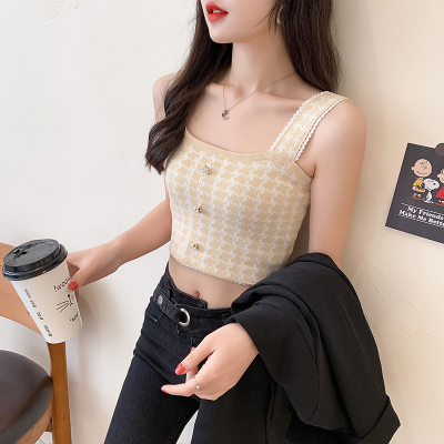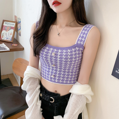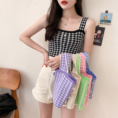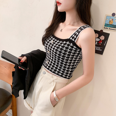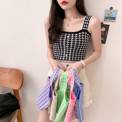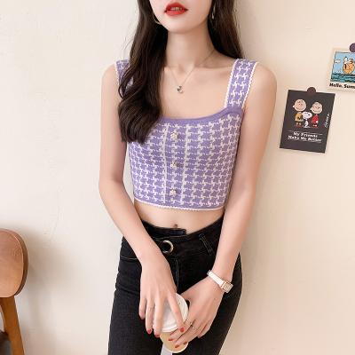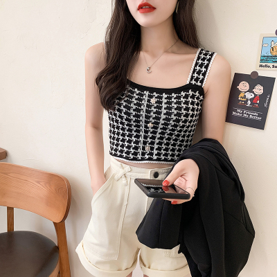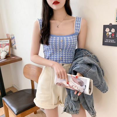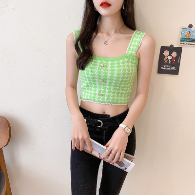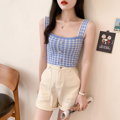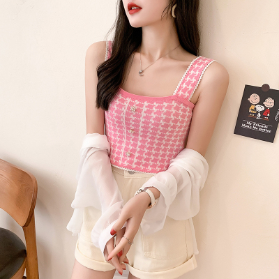 Summer new sweet versatile lace edge stitching Plaid knitted suspender vest with bottom coat