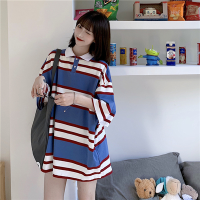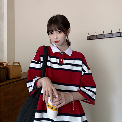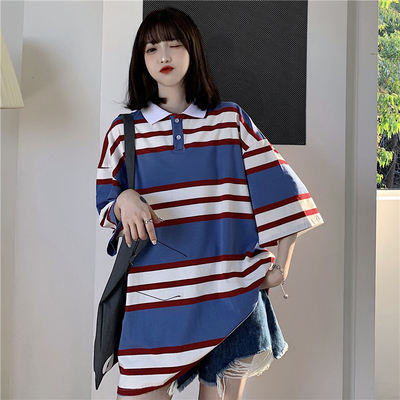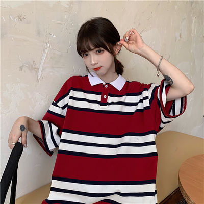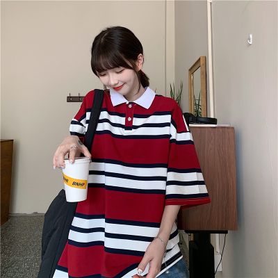 Real photo 2021 summer Stripe Polo Shirt Lapel short sleeve printed T-shirt for women