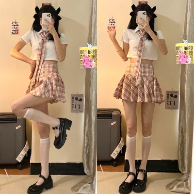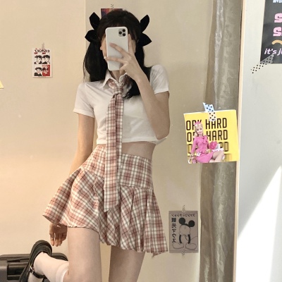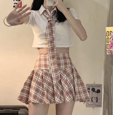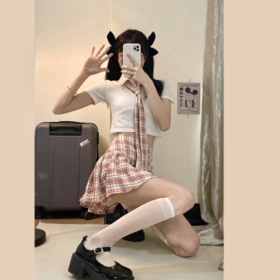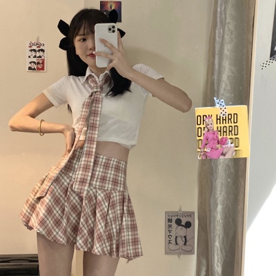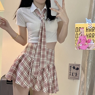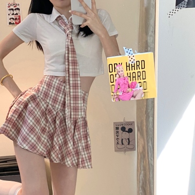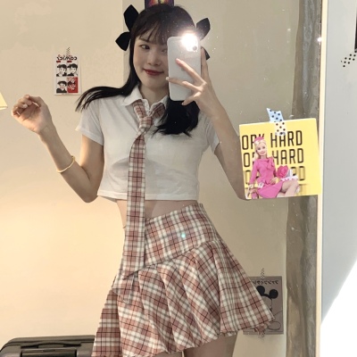 Real price sexy short shirt with tie + slim JK uniform high waist plaid skirt suit