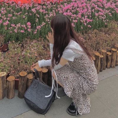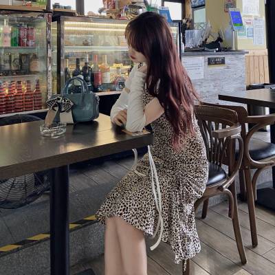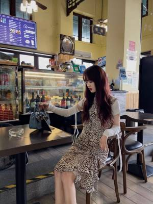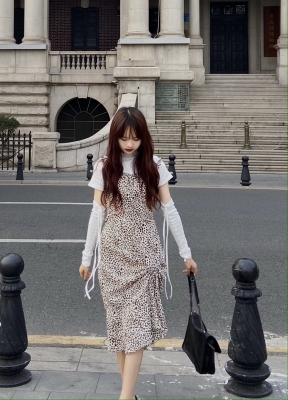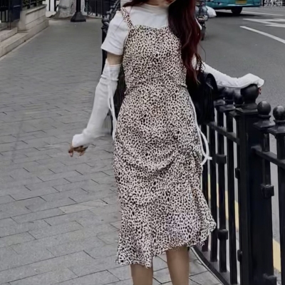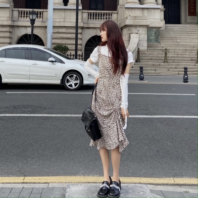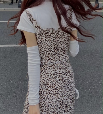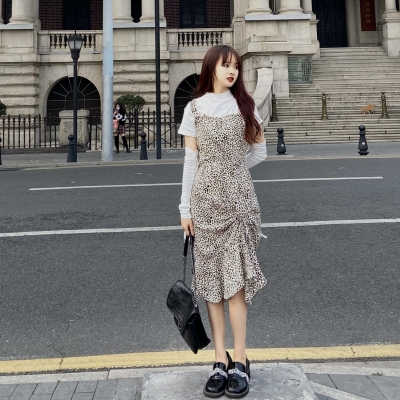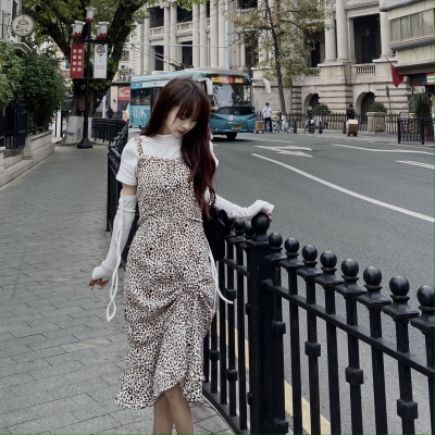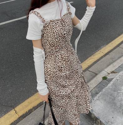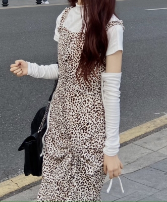 Real shooting wild and gentle, close waist leopard print suspender skirt can be folded into a dress, hot girl skirt + knitting base
