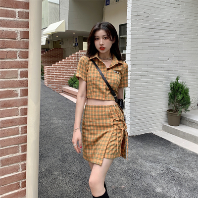 American style retro short sleeve top with word bandage short pants skirt suit