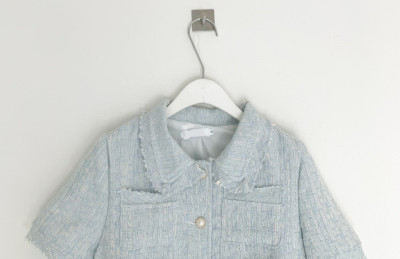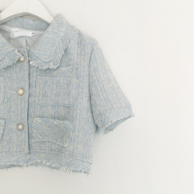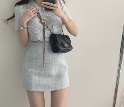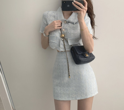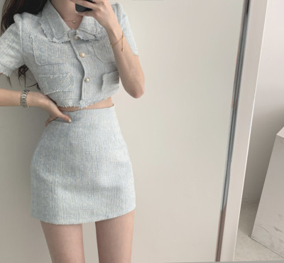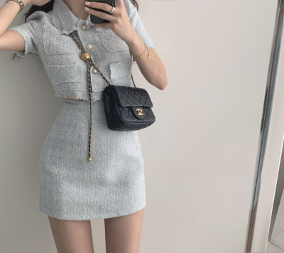 Fabric light blue Xiaoxiang Fengliu Su Short Jacket Top with buttocks and short skirt suit
