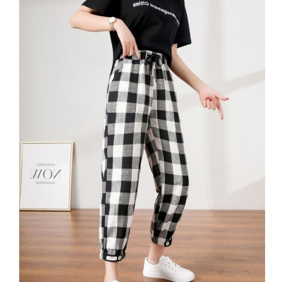 Plaid pants women's summer new student Korean loose thin nine point high waist straight tube leisure Harem Pants women