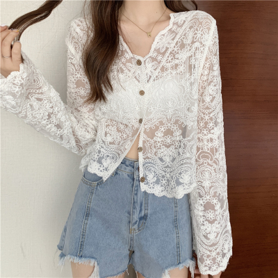 Real price: 2021 spring dress new style foreign style Blouse Top hook flower hollow out long sleeve lace blouse