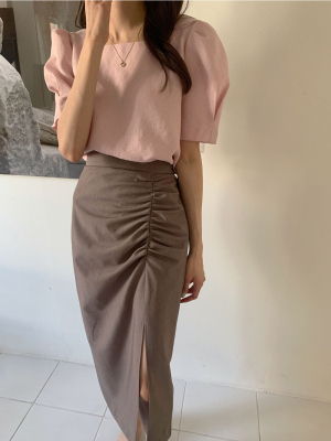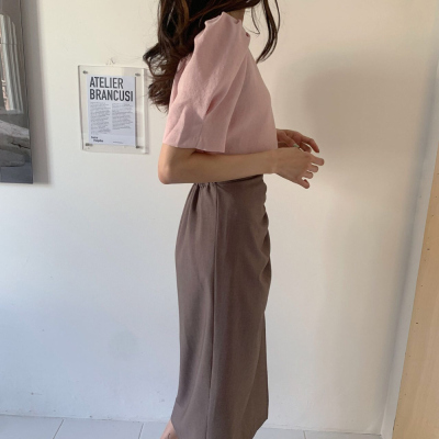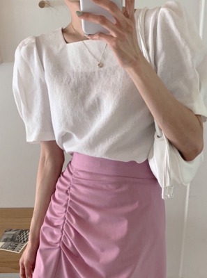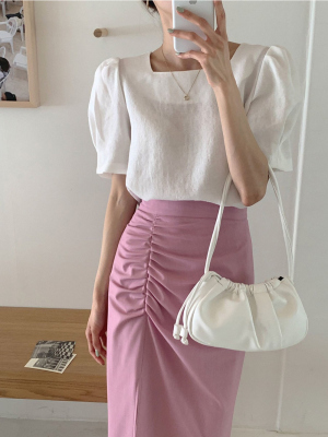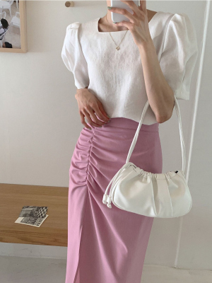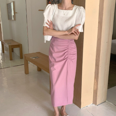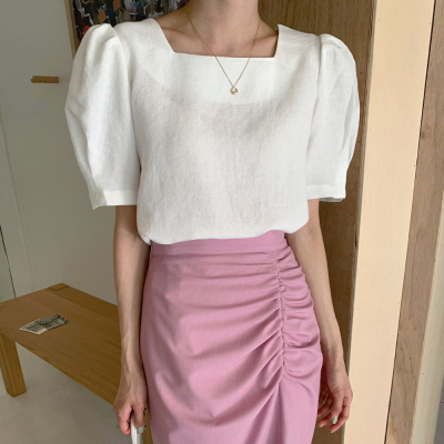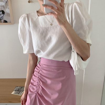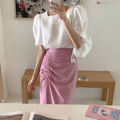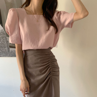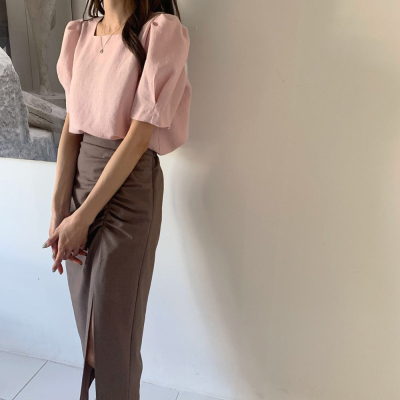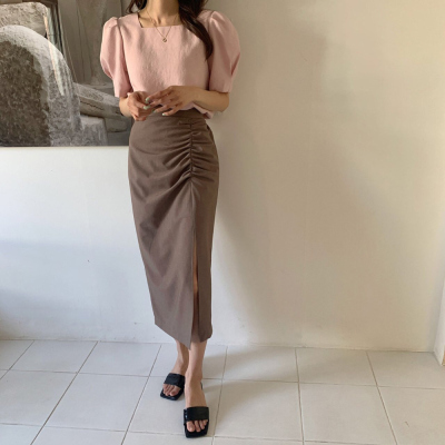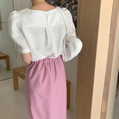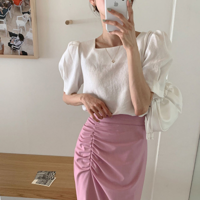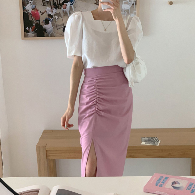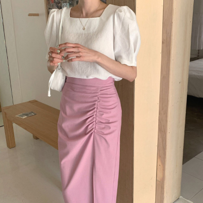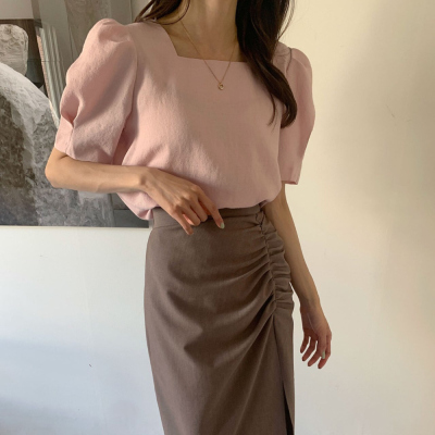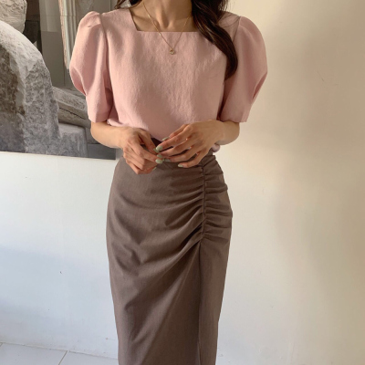 Korean chic square neck bubble sleeve shirt + pleated split skirt