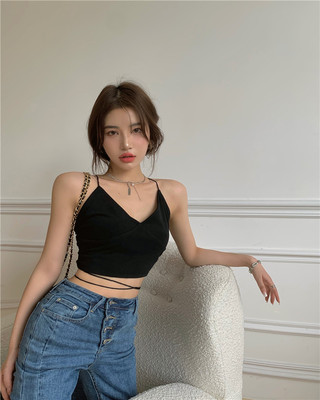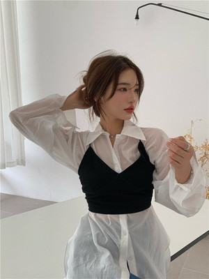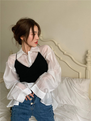 Real price Hong Kong style fashionable bubble sleeve long sleeve white shirt + open back cross bandage short hot girl suspender