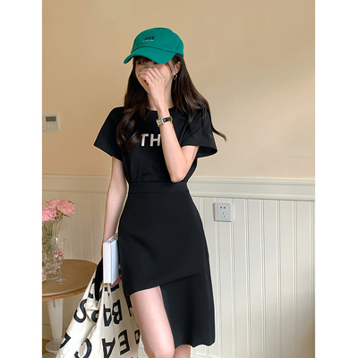 Real price ~ letter print round neck short sleeve T-shirt + irregular skirt