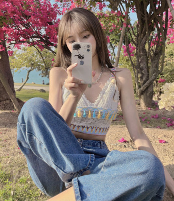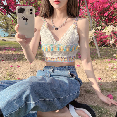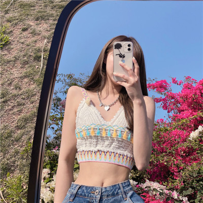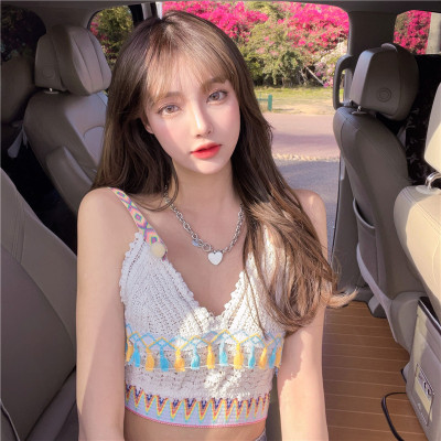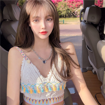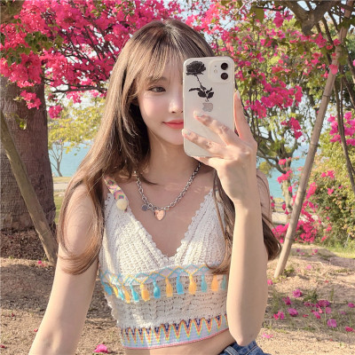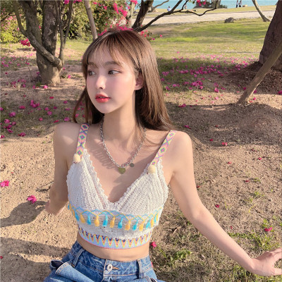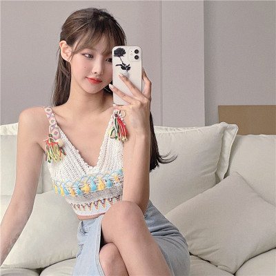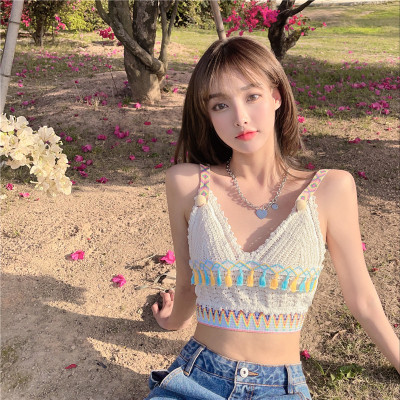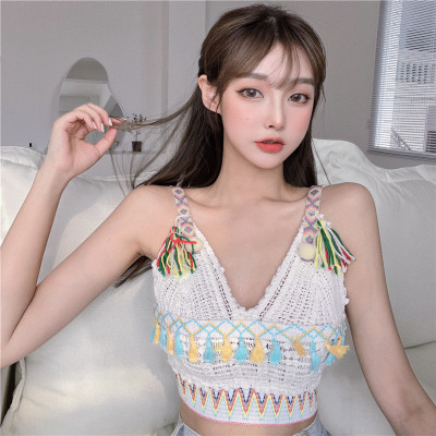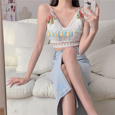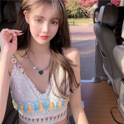 Real price real shot sexy open navel knitted vest Hong Kong Style V-neck tassel versatile suspender top