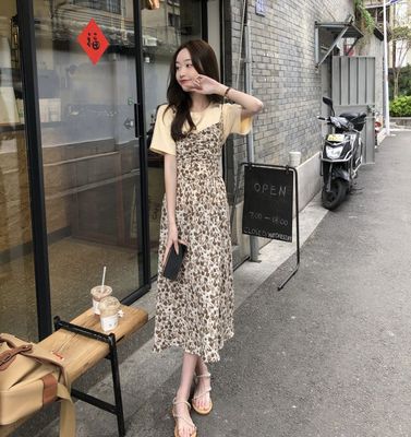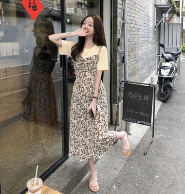 Real photo 2021 floral sleeveless slim suspender Dress Medium Length suspender skirt + T-shirt