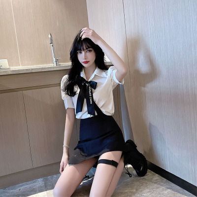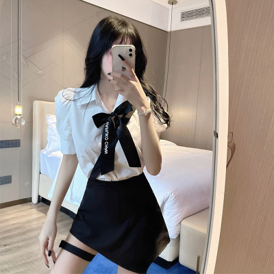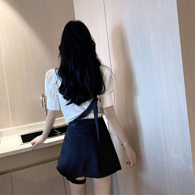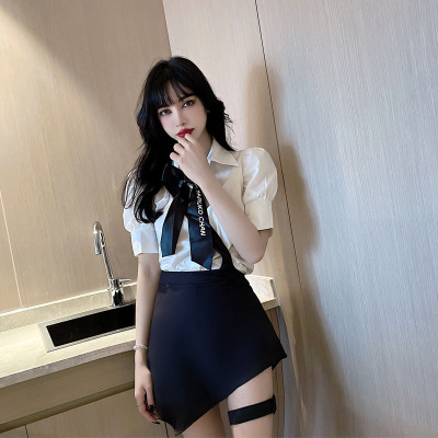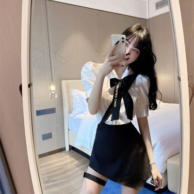 Real shot summer bow short sleeve shirt design sense leg ring strap skirt academy style age reduction fashion two piece women's suit