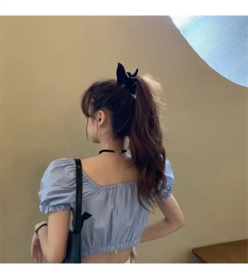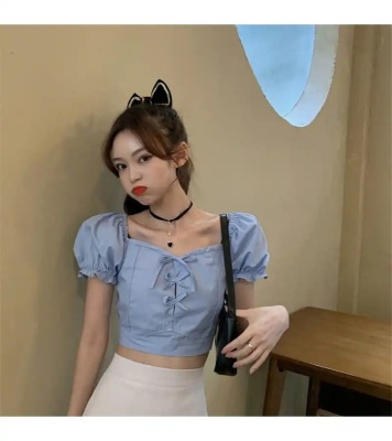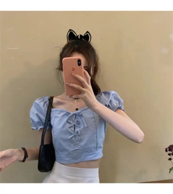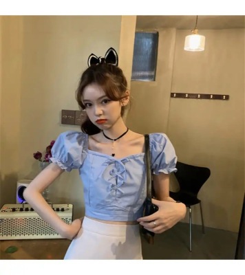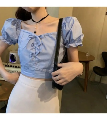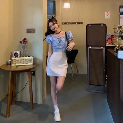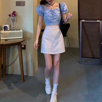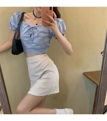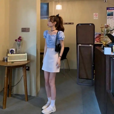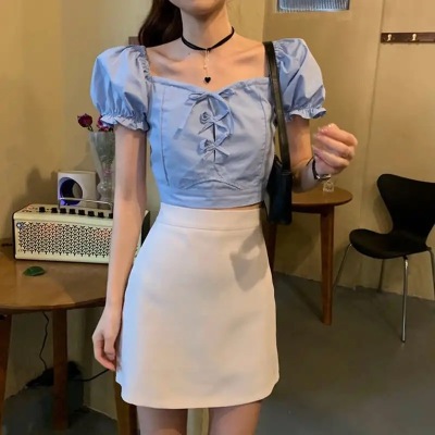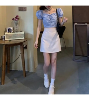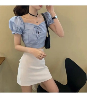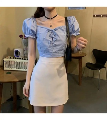 Summer small fresh Bubble Sleeve Shirt Short top high waist skirt suit two piece set