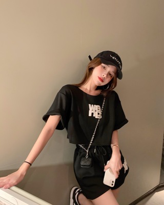 Real shooting leisure fashion sports suit net red same high waist slim short top + drawstring shorts two piece set