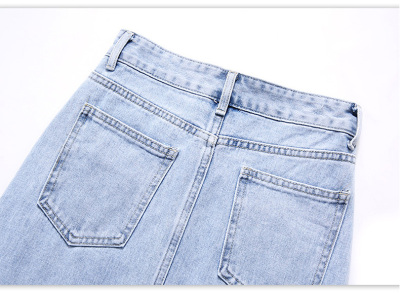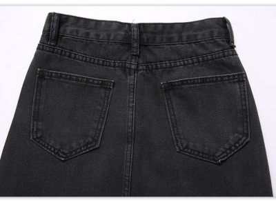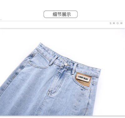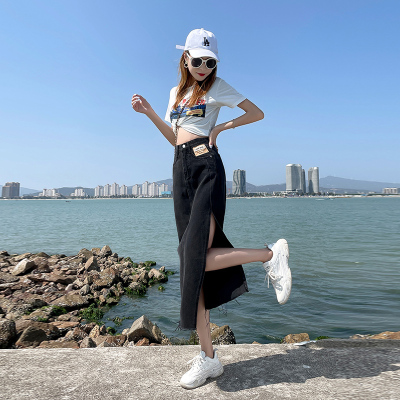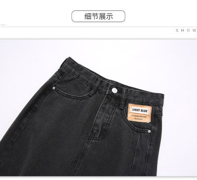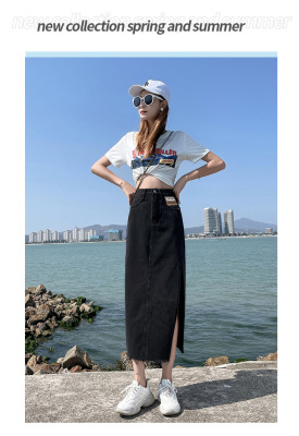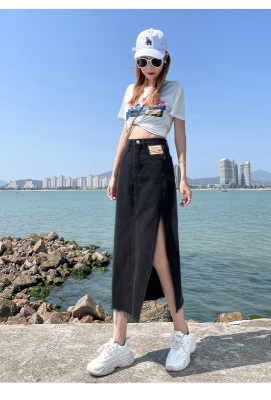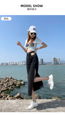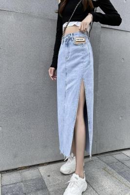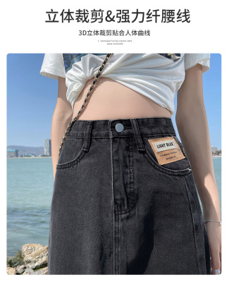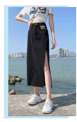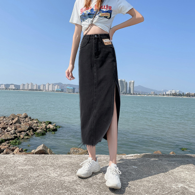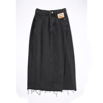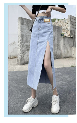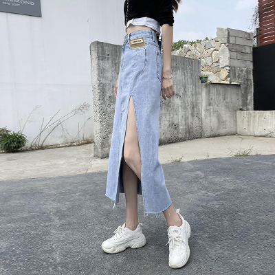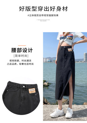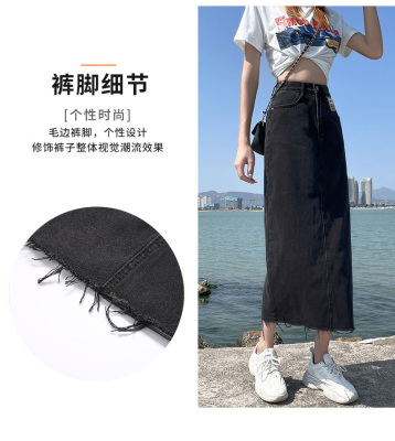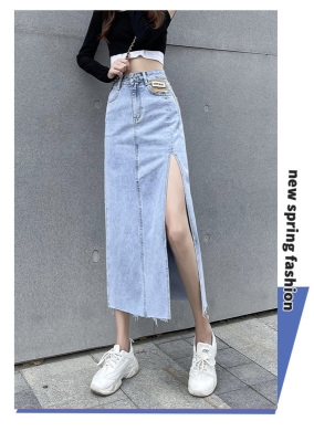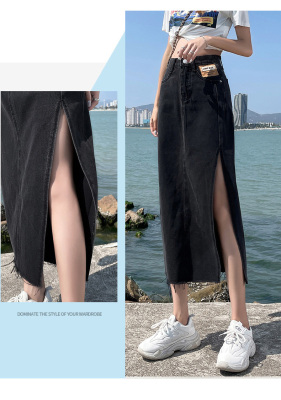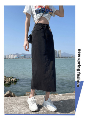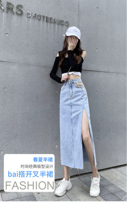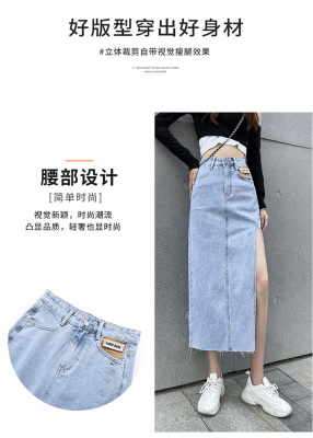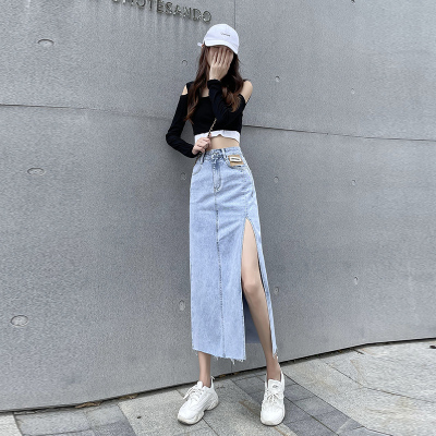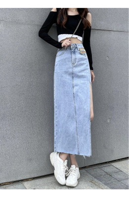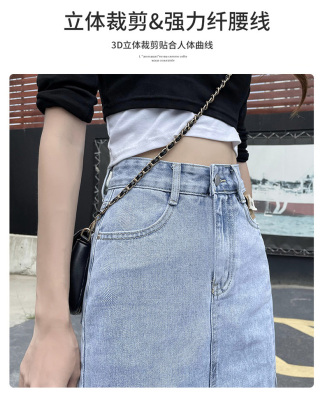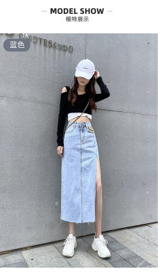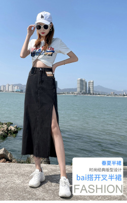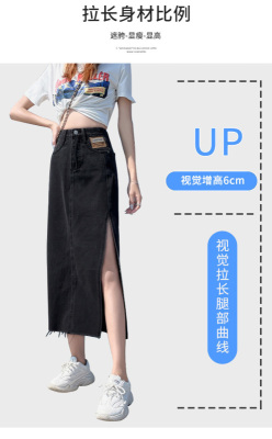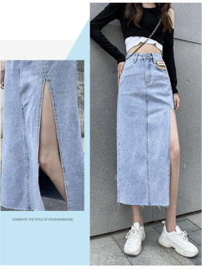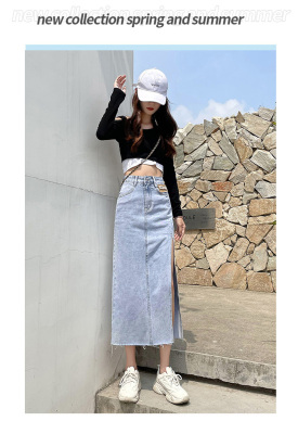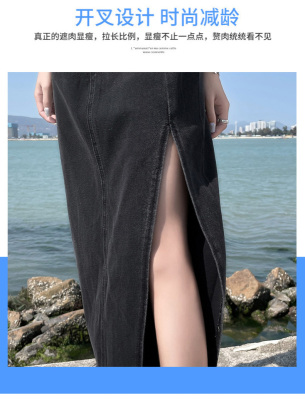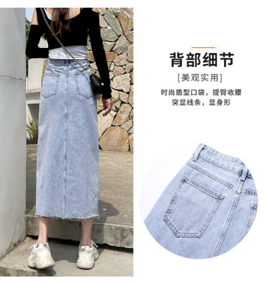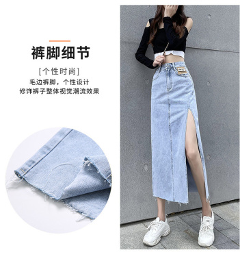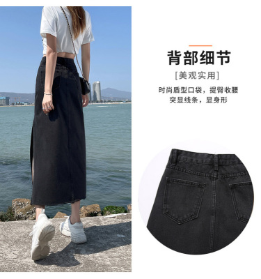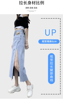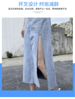 Net red with high waist and thin buttocks washed gradient split mid length denim skirt