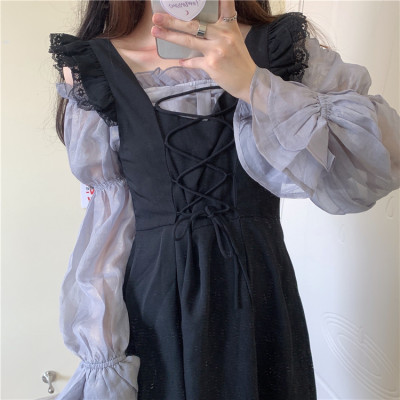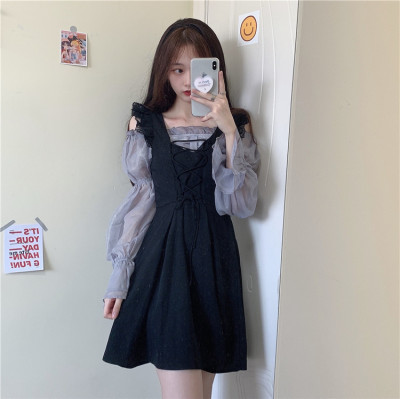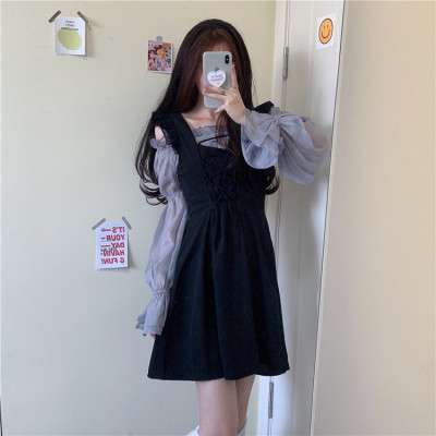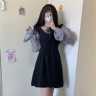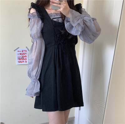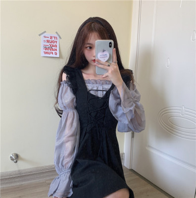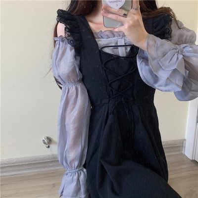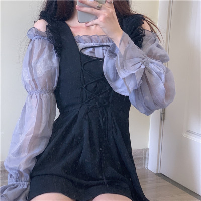 Real shot sleeveless strap dress lace one neck waist short chiffon shirt suit