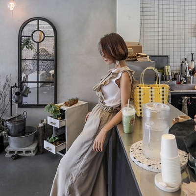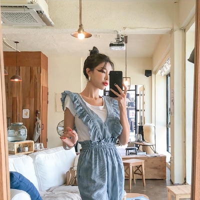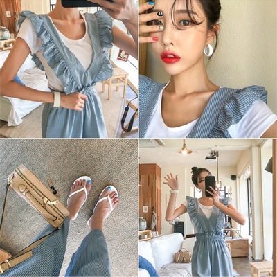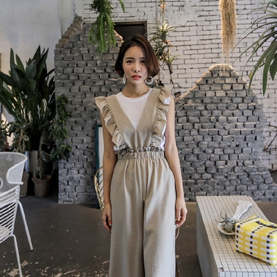 Ruffle V-neck show thin strap wide leg pants pants 2021 summer rubber waist linen Leggings Jumpsuit large