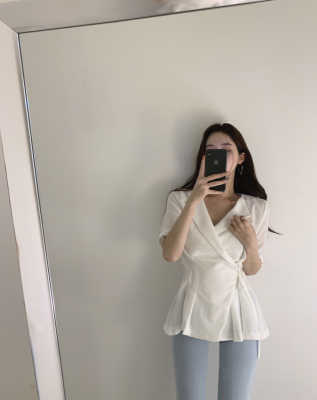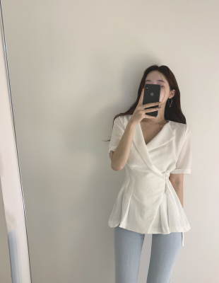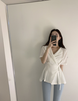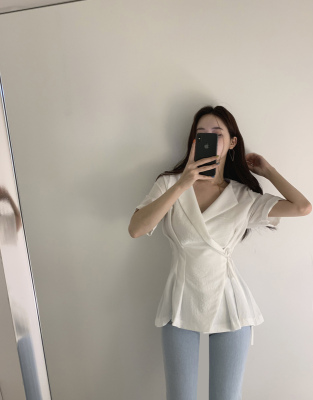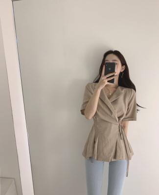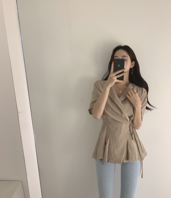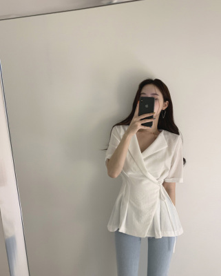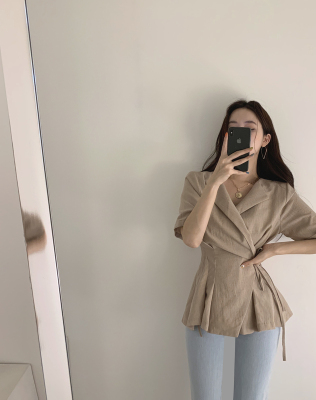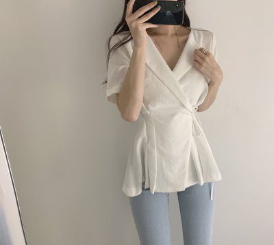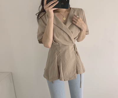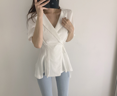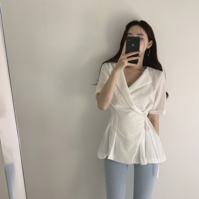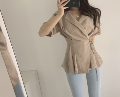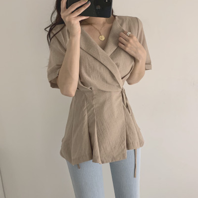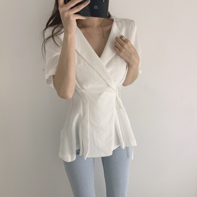 Summer retro French niche suit Lapel lace up waist slim shirt versatile top girl