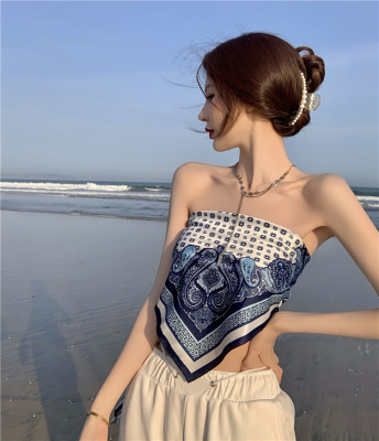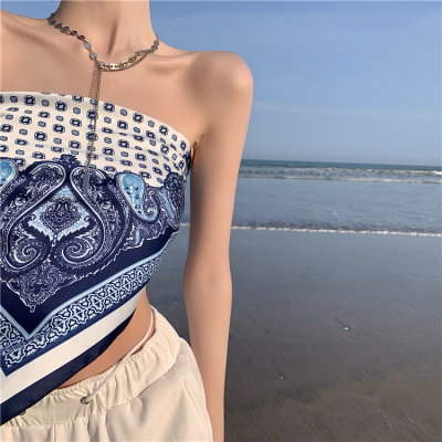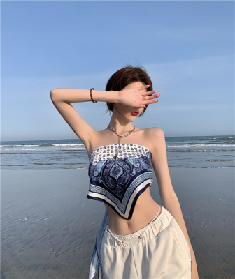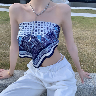 Retro print stitching short belly Pocket Vest women's new slim and navel revealing knitted suspender