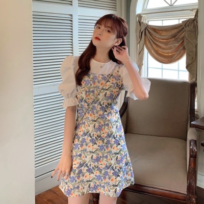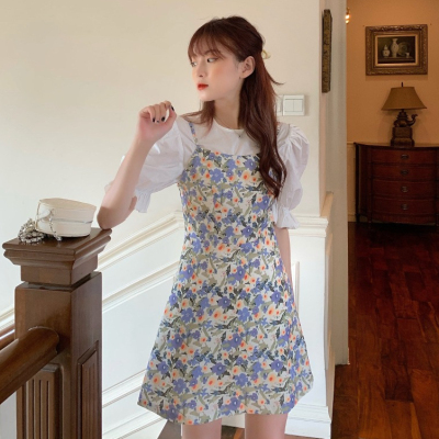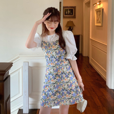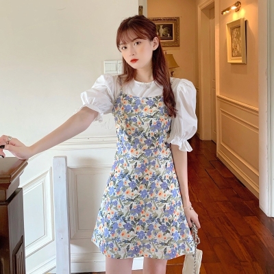 2021 summer new girls' sweet Mori floral suspender dress bubble sleeve top two piece suit