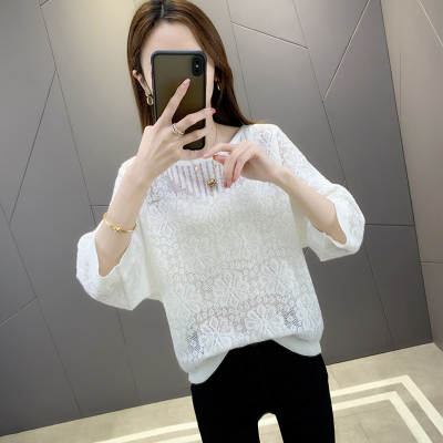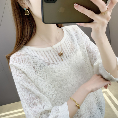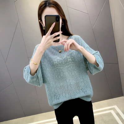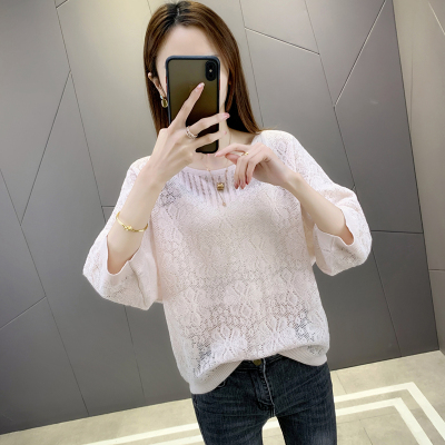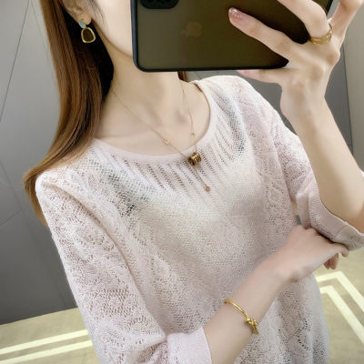 Early spring new women's summer 7 / 4 sleeve top hollow knitting bottom coat loose thin ice silk air conditioning shirt
