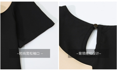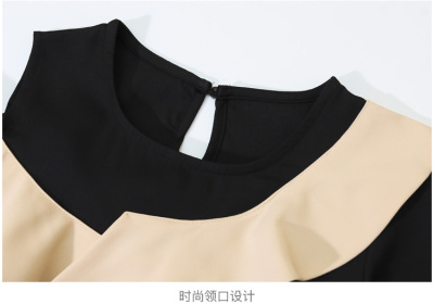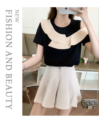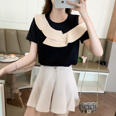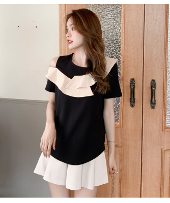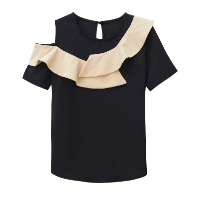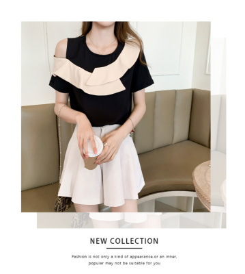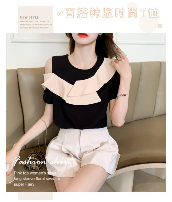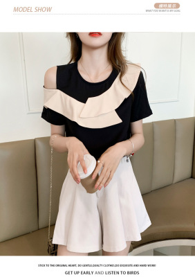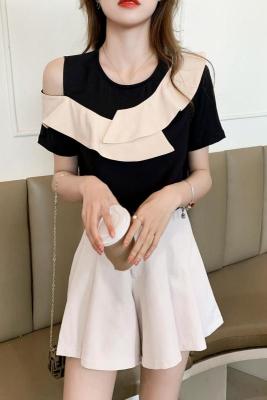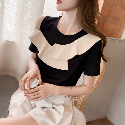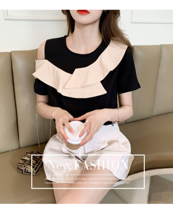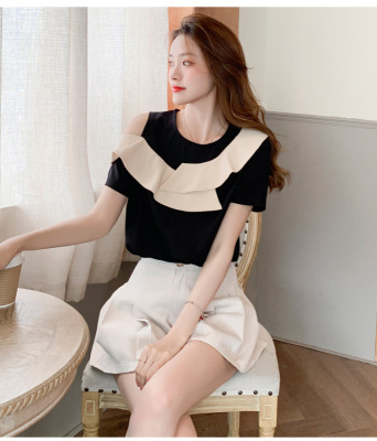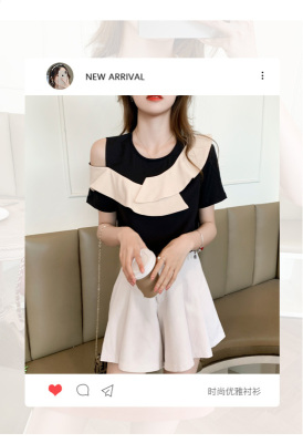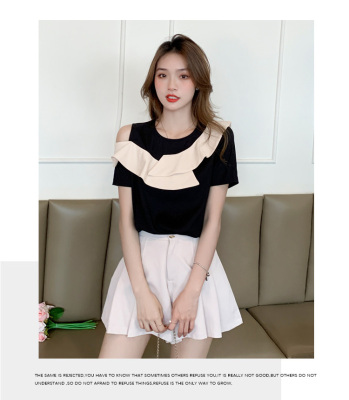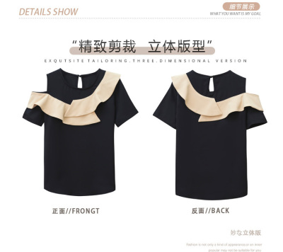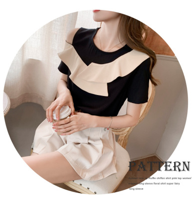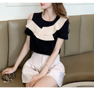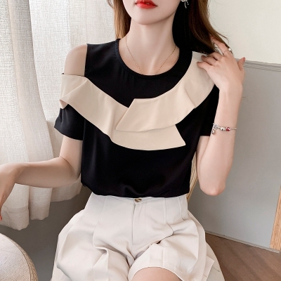 Real shot short sleeve belly covered chiffon shirt for women 2021 summer new elegant off shoulder Tibetan meat contrast Ruffle Top